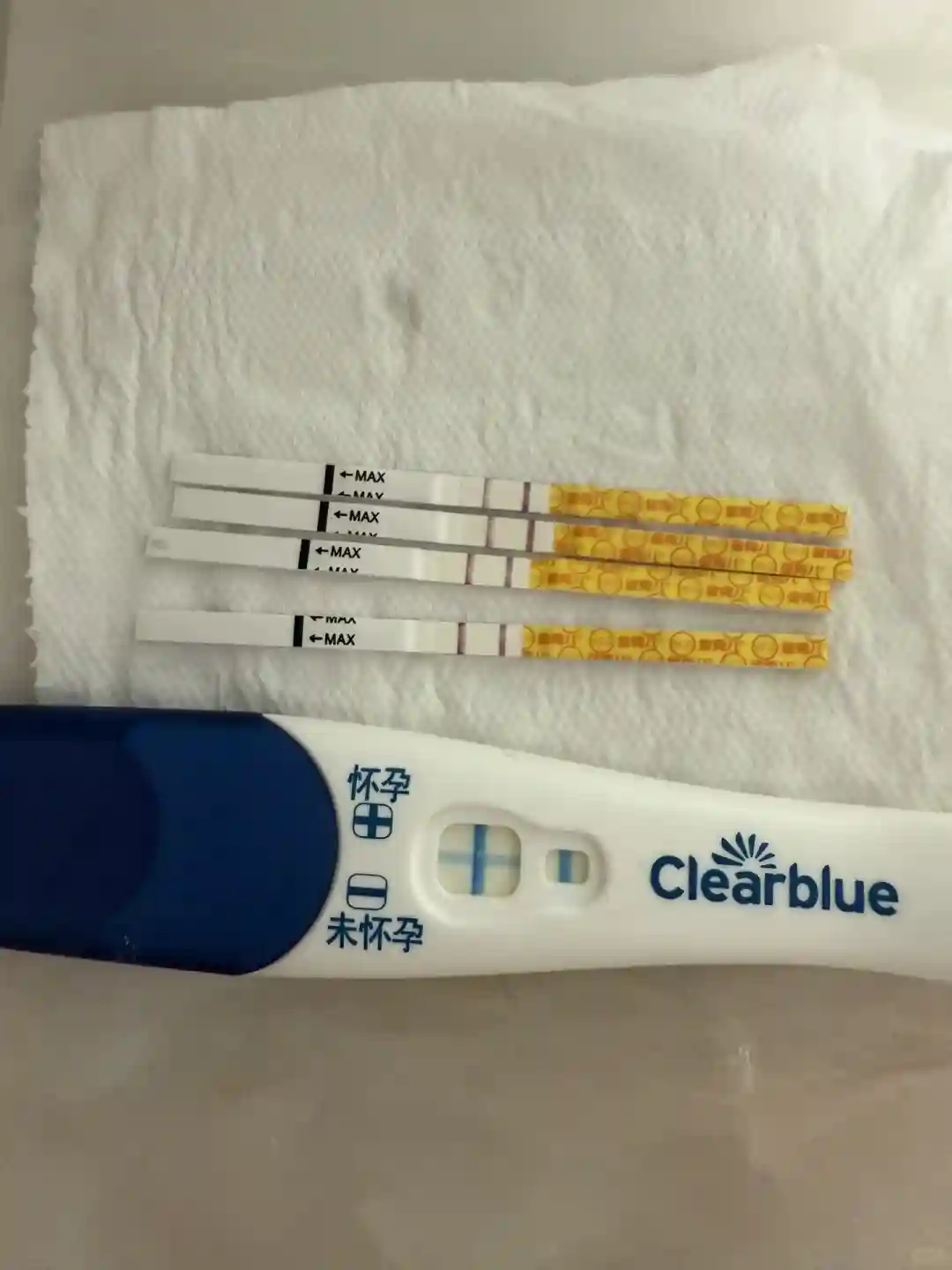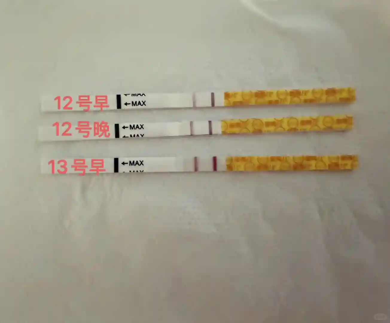 由于很好奇,很心急,12号没忍住,提前测了两次,晚上加深了。但是晚上出血了,吓得连夜回医院开医生。医生给开了间苯,和黄体酮当晚注射了。然后让我第二天提前抽血。所以就提前开奖啦!!!!
