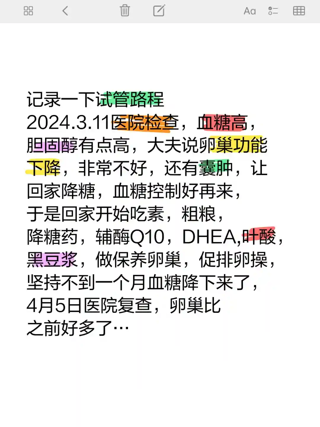 2024.3.11医院检查,血糖高,胆固醇有点高,大夫说卵巢功能下降,非常不好,还有囊肿,让回家降糖,血糖控制好再来,于是回家开始吃素,粗粮,降糖药,辅酶Q10,DHEA,叶酸,黑豆浆,做保养卵巢,促排卵操,坚持不到一个月血糖降下来了,4月5日医院复查,卵巢比之前好多了,开始扎针促排,4月9日医院复查B超,卵泡6个,抽血,尿常规,一套流程结束,接着扎针,4月12日同样流程,尿里白细胞高,回去多喝水,接着扎针,离医院来回太远决定在附近住下来,14日同样流程,白细胞还是高,吃药,喝水,15日检查白细胞降下来了,大夫定下来17日取卵,上午扎了一针,晚上扎夜针,这些天促排遭的罪告一段落,一共扎了26针,感觉一针比一针疼,取卵啥样还不知道,有啥感想说实话啥都不敢想,听天由命吧