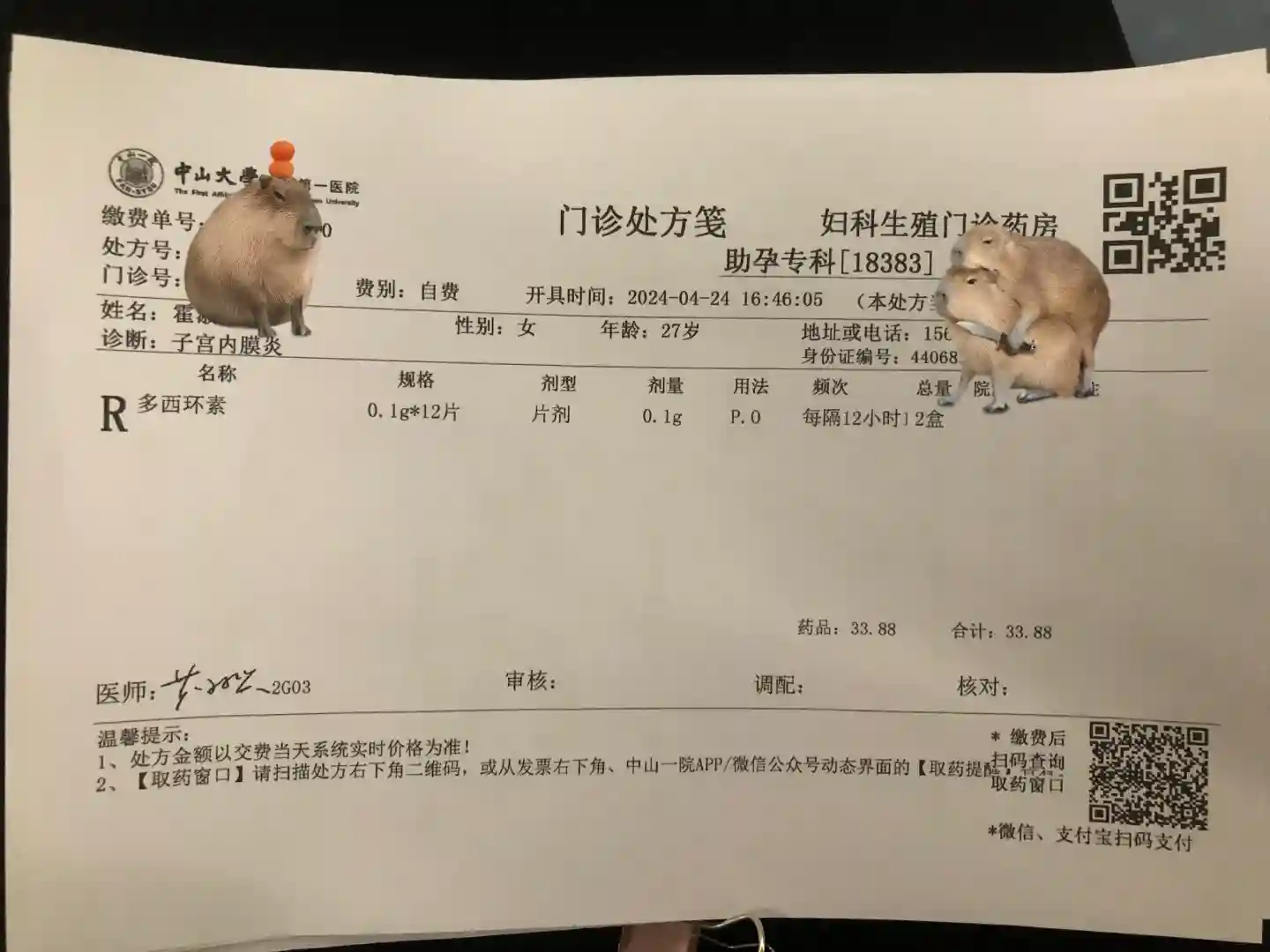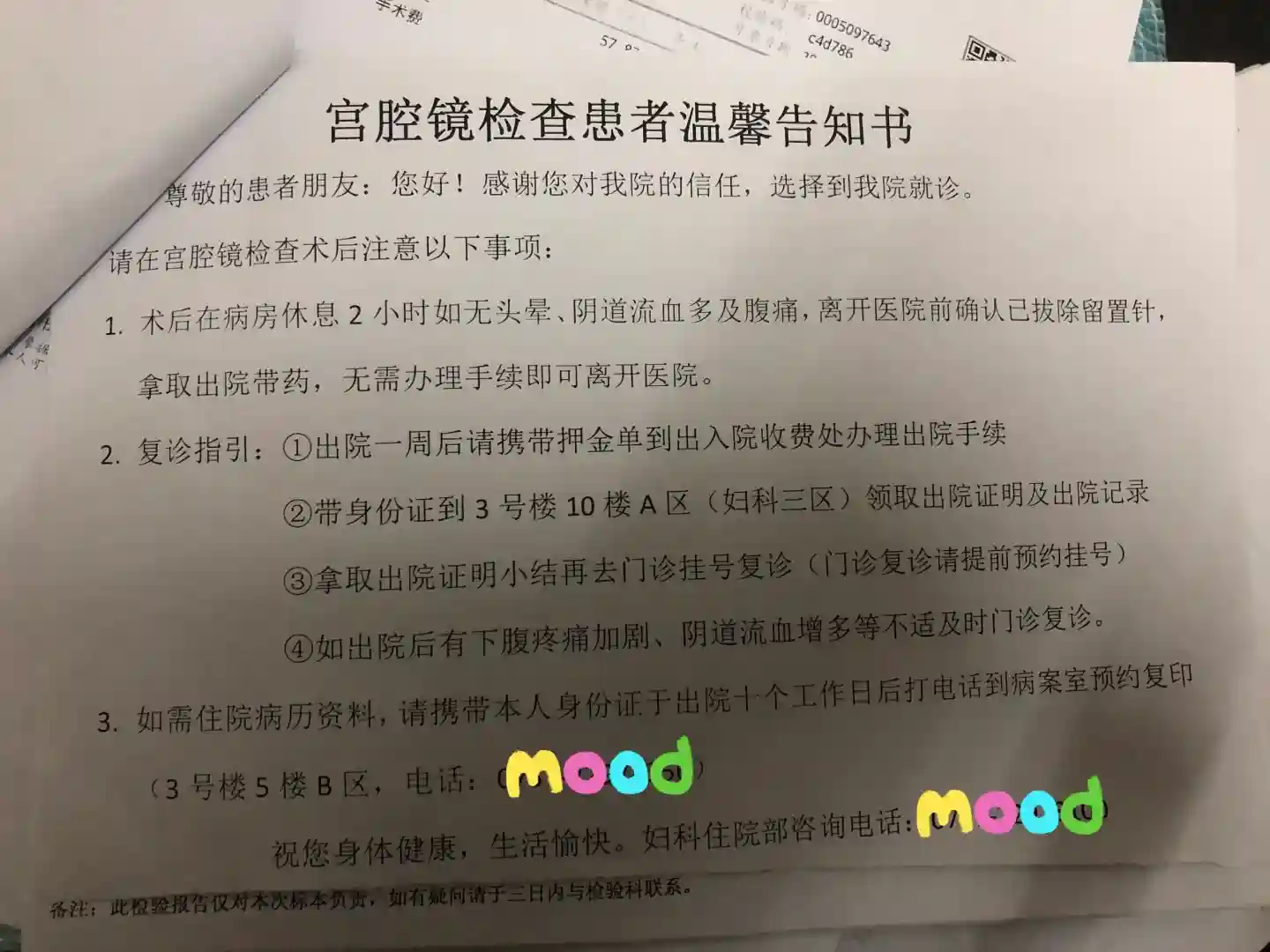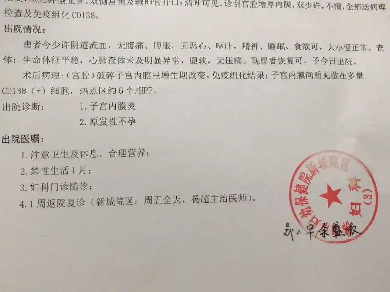 一个星期后去出入院收费处办理退费,带上身份证和医保卡,佛山医保可以报销。再去病房护士站拿出院小结。术后我的病理结果是CD138+细胞,热点区6个/HPF。一看有子宫内膜炎,立马回中一开了12天的多西环素。