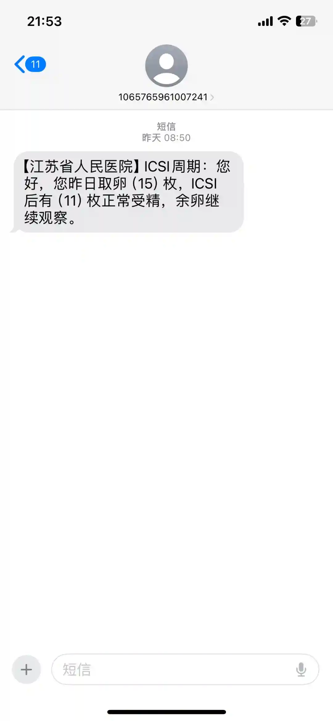 昨天收到短信15受精11稍稍失望~毕竟市妇幼那次我是全部受精的…唉…但不得不说,省人医手术技术好像是比市妇幼好。因为我经历过一次,给大家分享分享~