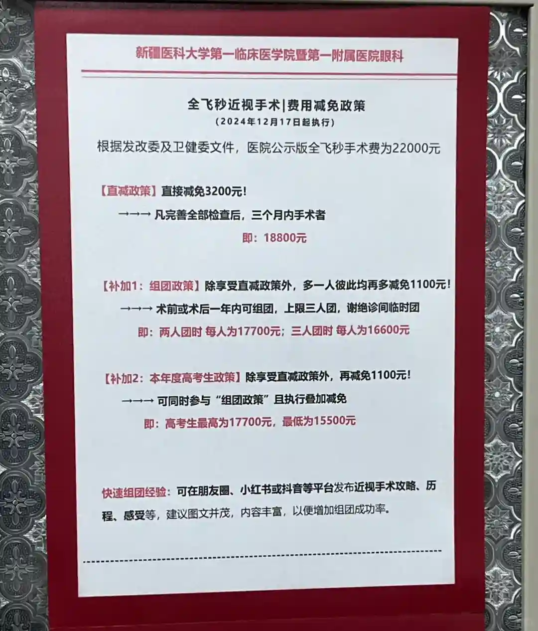 图三四是医院最新优惠政策,现求一到二位和我一起组团的,二人成团每人可减免1100,三人成团每人减2200,图片是拍的医院官方最新的通知比较详细。